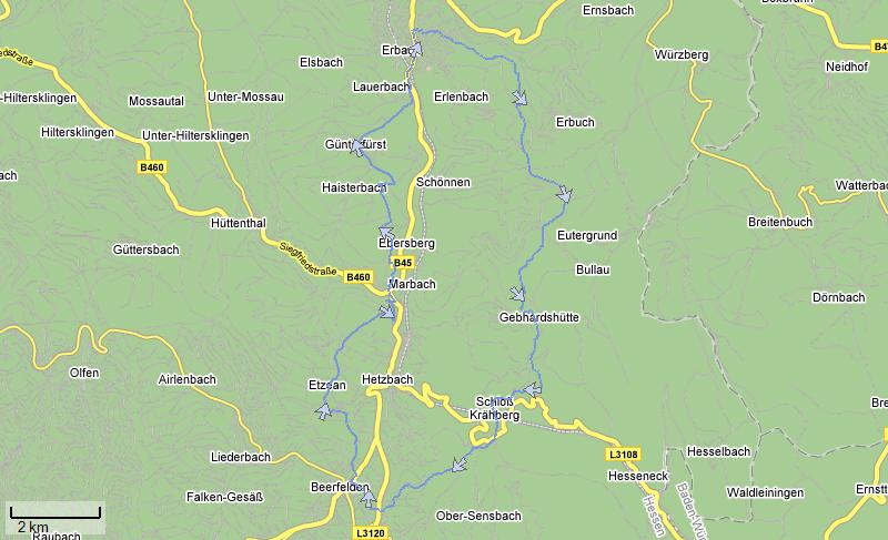 nun ja, der ganze odenwald ist es noch nicht … aber immerhin, einen großen teil des odenwaldkreises habe ich am samstag laufend (d.h. rennend) umrundet. die neu ausgedachte runde startet natürlich in erbach, führt über den buchwaldskopf und sonnenweg zum bullauer bild hinauf. von dort geht es dann zur gebhardtshütte, vorbei an den freilaufenden ziegen wieder in den wald in richtung krähberg. der wird knapp unterhalb des gipfels (und des schlosses) halb umrundet, um dann hinab zum reußenkreuz zu rennen. von dort führt der wanderweg über den eingang des sensbachtals zurück ins mümlingtal, wo der abstieg, der ganz schön lang und ganz schön tief wird, in richtung beerfelden beginnt. vorbei am skilift geht es dann über die bundesstraße durch den ort zum metzkeil, den man noch ein stück hinunterlaufen muss. dann führt der weg wieder aus beerfelden hinaus – dieses mal aber auf der anderen seite, nämlich in richtung etzean. bis dorthin sind es aber noch einmal ein paar höhenmeter. durch etzean schnell hindurch, geht es weiter in richtung marbach, vorbei am hetzbacher golfplatz und dann wieder steil hinab. ab der villa sonnenschein die letzten meter bis zur marbach auf der bundesstraße, die dann überquert wird, um auf der anderen seite wieder den – verdammt steilen – hang in richtung haisterbach hinaufzuklettern. oder zu gehen … der hügel ist dann doch wieder recht hoch, aber man ist ja jetzt schon auf dem heimweg … über haisterbach geht es, in einer kleinen schleife, nach günterfürst. dort noch schnell durch den ort, am sportplatz vorbei und damit wieder auf die nächste kuppe. die wird aber schnell wieder verlassen, denn es geht hinab nach lauerbach – wiederum verflixt steil hinab. dann wird’s aber einfach: nur noch die b45 durch erbach und fix nach hause. auf der karte sieht das so aus (die karte ist mit sporttracks aus meinen gps-daten und dem kartenmaterial von google-maps erstellt worden):