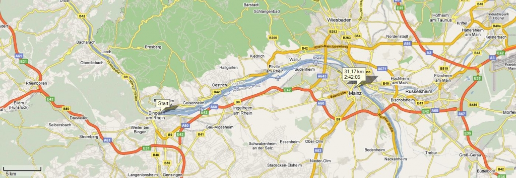 bingen – mainz: das sind genau diese 31,17 km. für mich sind das 2:41:03 laufen – laufen, laufen, laufen ohne ende. naja, zwei kleine pausen gab es schon, zum pinkeln in der nähe von budenheim und dann leider ein ampelstopp in mainz. da war so etwas nämlich schon etwas schmerzhaft. aber der reihe nach. zuerst die karte mit route: